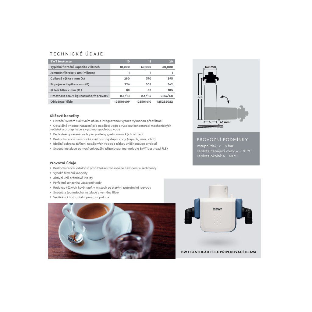 BWT Besttaste je ideální volbou ve dvou případech. Zaprvé: máte měkkou vodu (netvoří se vám vodní kámen), ale chcete vylepšit její chuť pro přípravu nápojů. Zadruhé: pro výdejníky studené vody (POU systémy) v kancelářích a čekárnách. Upozorňujeme, že tento filtr neodstraňuje vodní kámen. Pokud máte tvrdou vodu, doporučujeme sáhnout po řadě Bestmax. Instalace je snadná díky univerzální hlavě BWT Besthead a filtr může pracovat v horizontální i vertikální poloze, což usnadňuje montáž ve stísněných prostorech pod barem.