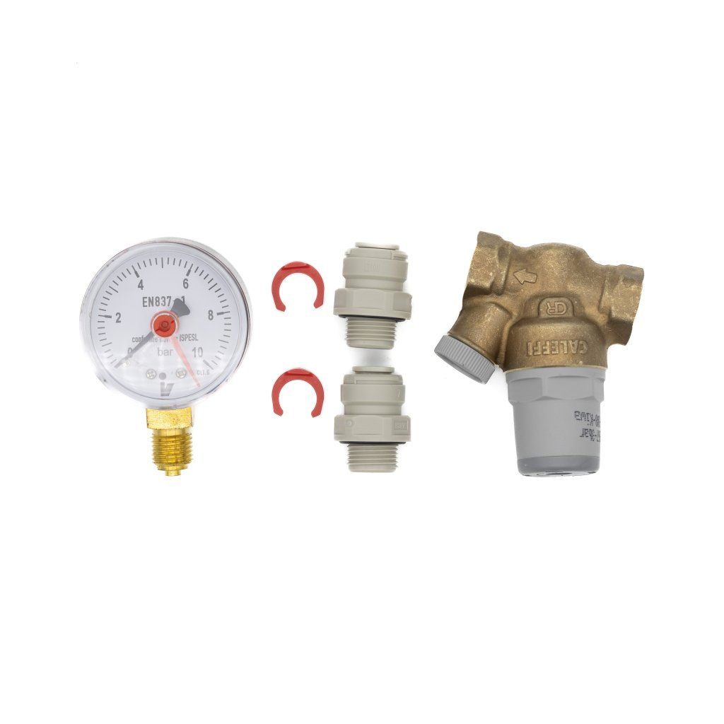 Produkt je dodáván jako nezkompletovaná sada. To znamená, že manometr a případné další fitinky nejsou napevno našroubovány v těle ventilu. Toto řešení ocení zejména instalační technici, kteří si tak mohou zvolit orientaci manometru nebo pořadí komponentů přesně podle prostorových možností konkrétního baru či skříňky. Pro kompletaci doporučujeme použít vhodné těsnění závitů (teflonová páska nebo lepidlo). Je to robustní a spolehlivý prvek, který by měl být instalován před každý kávovar.