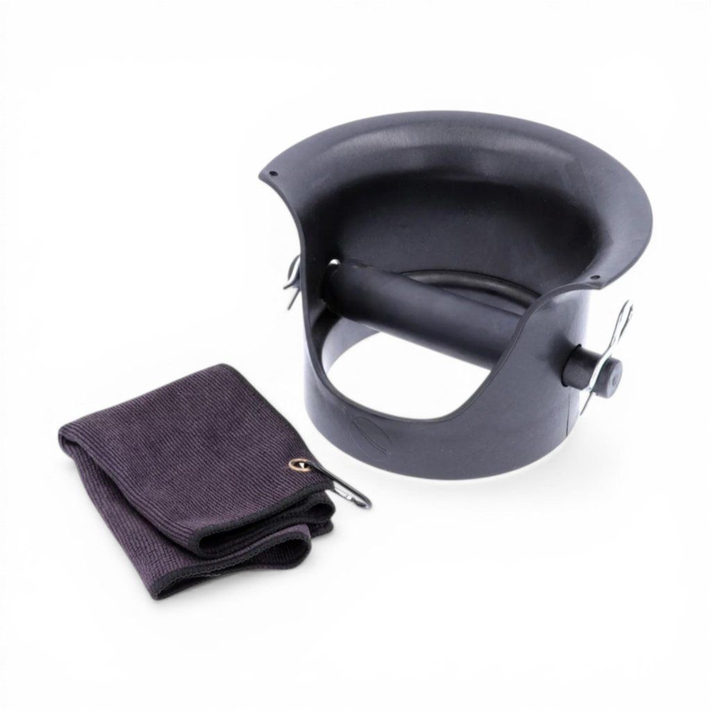 Navzdory své velikosti je tento odklepávač překvapivě lehký, ale díky promyšlené konstrukci velmi stabilní. Dno je opatřeno protiskluzovou úpravou, která zajišťuje, že nádoba zůstane při úderu pevně na místě a nepohne se po kuchyňské lince. Klíčovou součástí je pevná vyklepávací tyč, potažená odolnou gumou. Tato vrstva má zásadní funkci: tlumí hluk (náraz kovu o kov by byl nepříjemně hlasitý) a chrání sítko a hrany vašeho portafiltru před mechanickým poškozením.