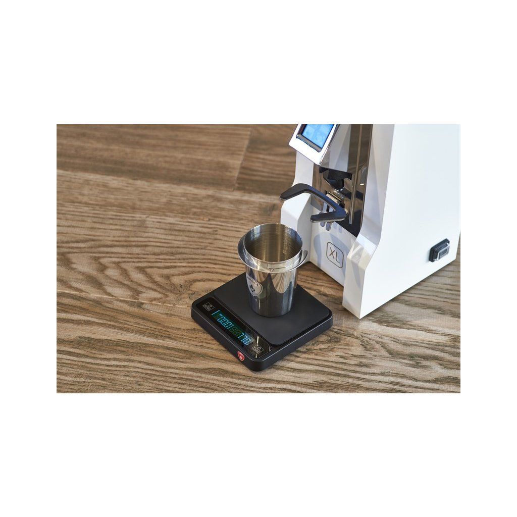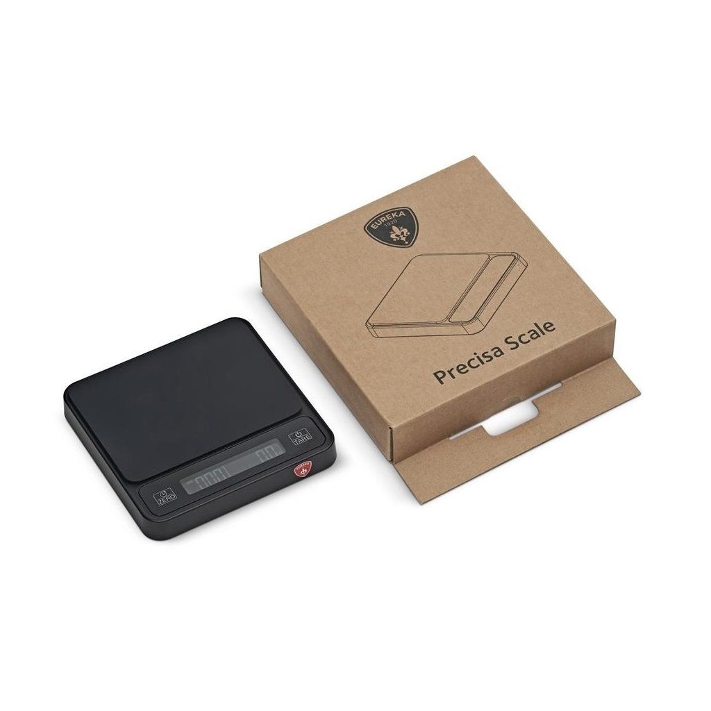 Název "Precisa" nelže. Váha měří s přesností na 0,1 gramu a má kapacitu až 2000 g, což z ní činí univerzální nástroj pro vážení namleté dávky (dosing), samotného shotu espressa (yielding) i pro přípravu filtrované kávy. Její minimalistický černý design s podsvíceným LCD displejem a dotykovými tlačítky skvěle koresponduje s estetikou mlýnku Eureka Mignon. Díky kompaktním rozměrům ji snadno sbalíte i na cesty.