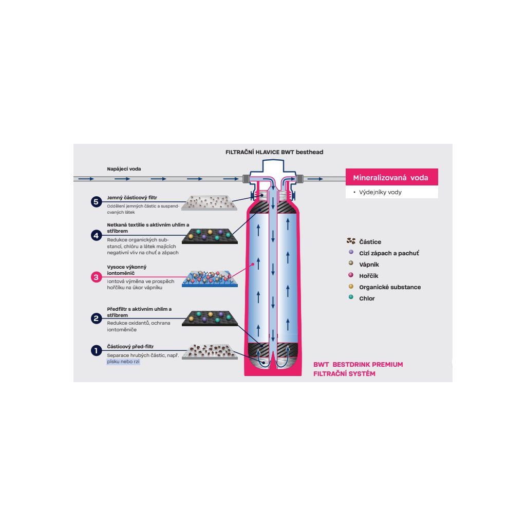 Srdcem této patrony je unikátní technologie BWT Magnesium Mineralized Water. Proces filtrace probíhá v pěti stupních, přičemž klíčovou fází je patentovaný iontoměnič. Ten nejenže odstraňuje z vody vápník (čímž brání tvorbě vodního kamene), ale nahrazuje jej cenným hořčíkem (Mg2+). Hořčík je známý jako nositel chuti a minerál důležitý pro naše fyzické i duševní zdraví. Filtr zároveň přes aktivní uhlí efektivně eliminuje pachuť chlóru, těžké kovy a organické nečistoty. Výsledkem je voda s vyváženým pH, která je jemná, chutná a ideální i pro přípravu studených nápojů.